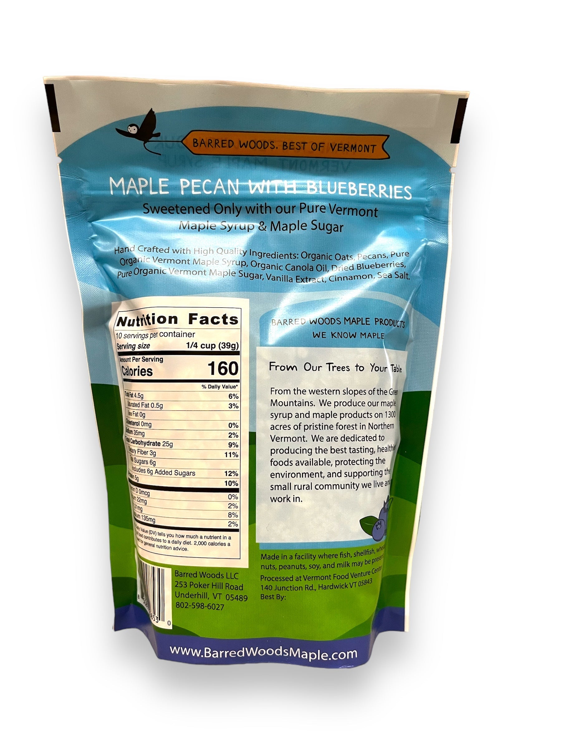 New package size - 10oz resealable standup pouch. World's Best Granola - All Natural Ingredients. Made with Organic Oats, Crunchy Pecans and Sweetened Only with our Pure Organic Vermont Maple Syrup and Maple Sugar. This flavor adds sweet blueberries which combined with our maple syrup give a one-two punch of healthy anti-oxidants to go along with its delicious taste. Make Wise Choices and Buy Barred Woods Maple Crunch Granola.
