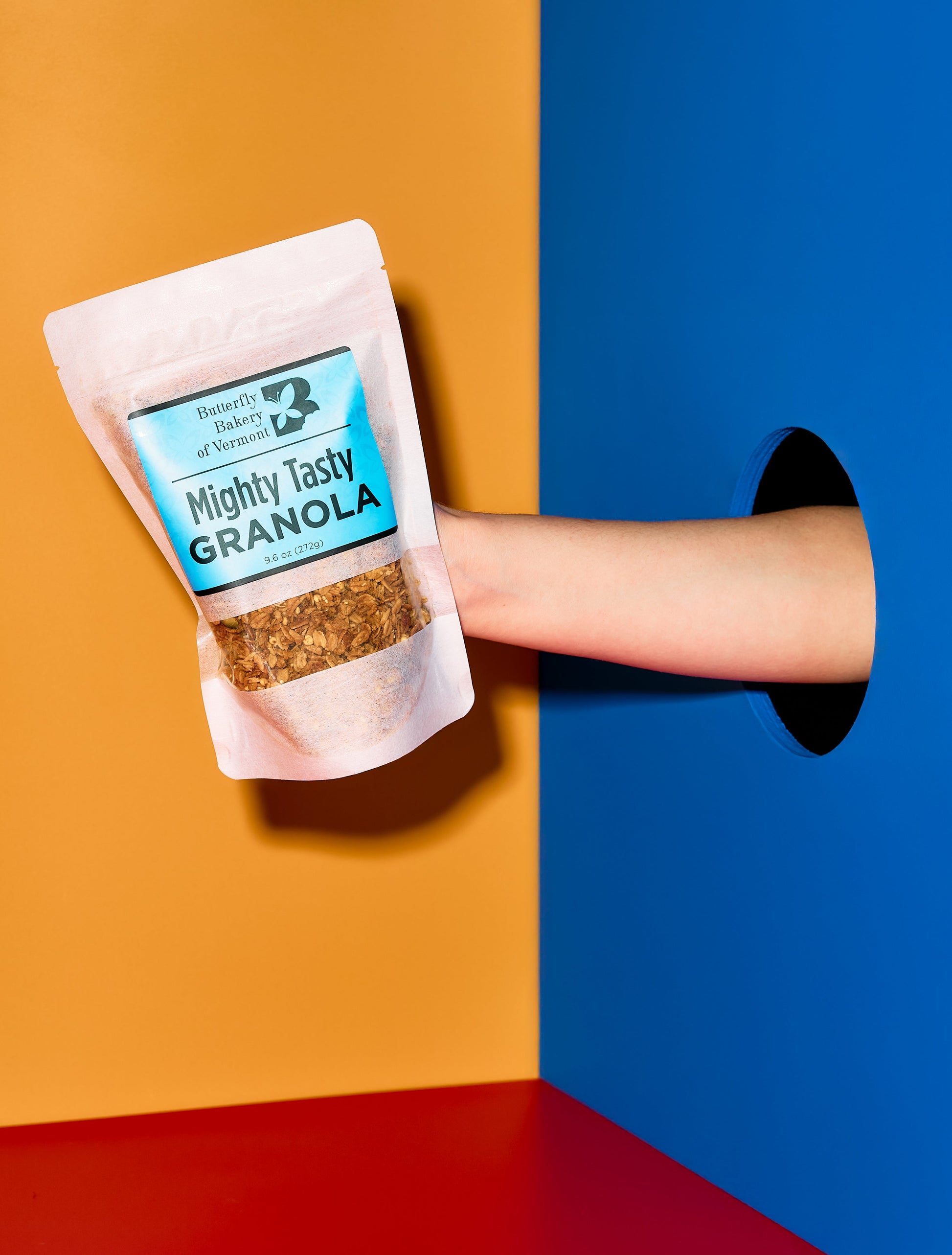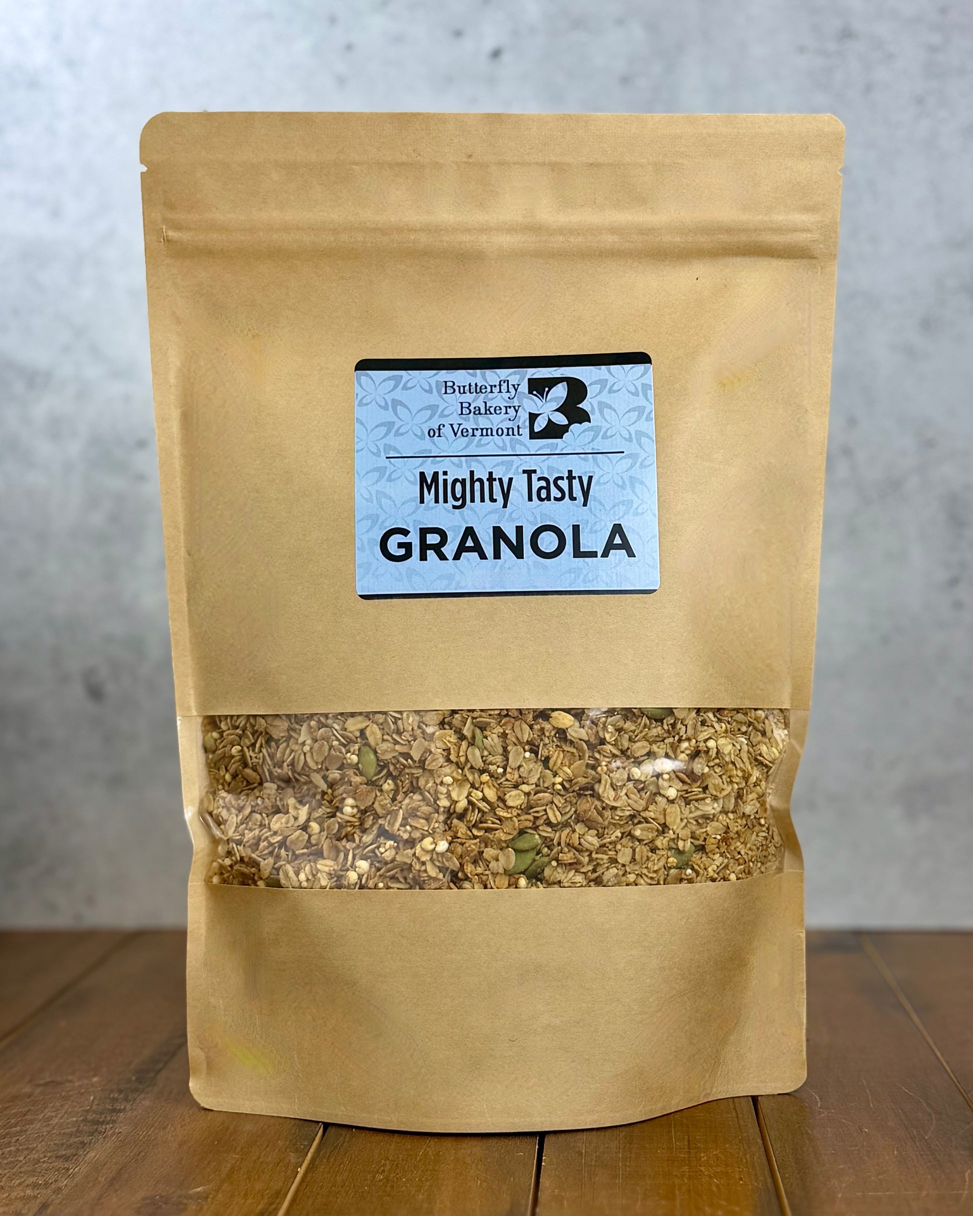 Mighty Tasty Granola combines a natural sweetness from pure Vermont maple syrup with an unexpected blend of cardamom, nutmeg, fennel, and fenugreek. Made with hearty oats, toasted coconut, quinoa and pumpkin seeds it offers a warm, maple-forward flavor. The granola reflects Butterfly Bakery of Vermont’s commitment to crafting small-batch, maple-sweetened baked goods that highlight the flavor and quality of Vermont ingredients.