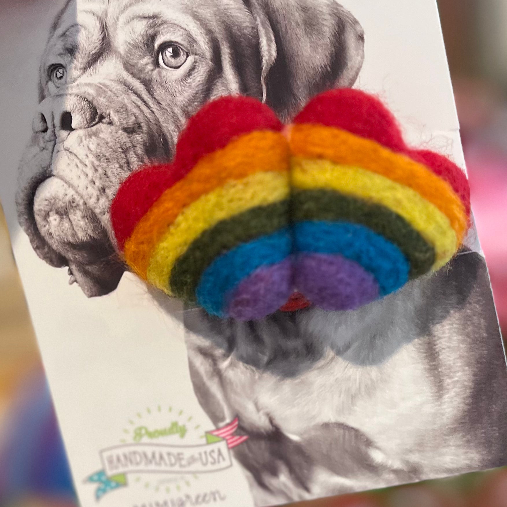Handmade in the USA from American made wool felt, an elastic ring wraps around the collar for perfect placement—and easy on/off. Each heart measures 1.75" x 1.5" and can easily be used with a collar width of 1" to 1.5" wide. (The "small" hearts have the same size heart but an elastic band to fit a collar width 5/8" to 3/4" wide.)