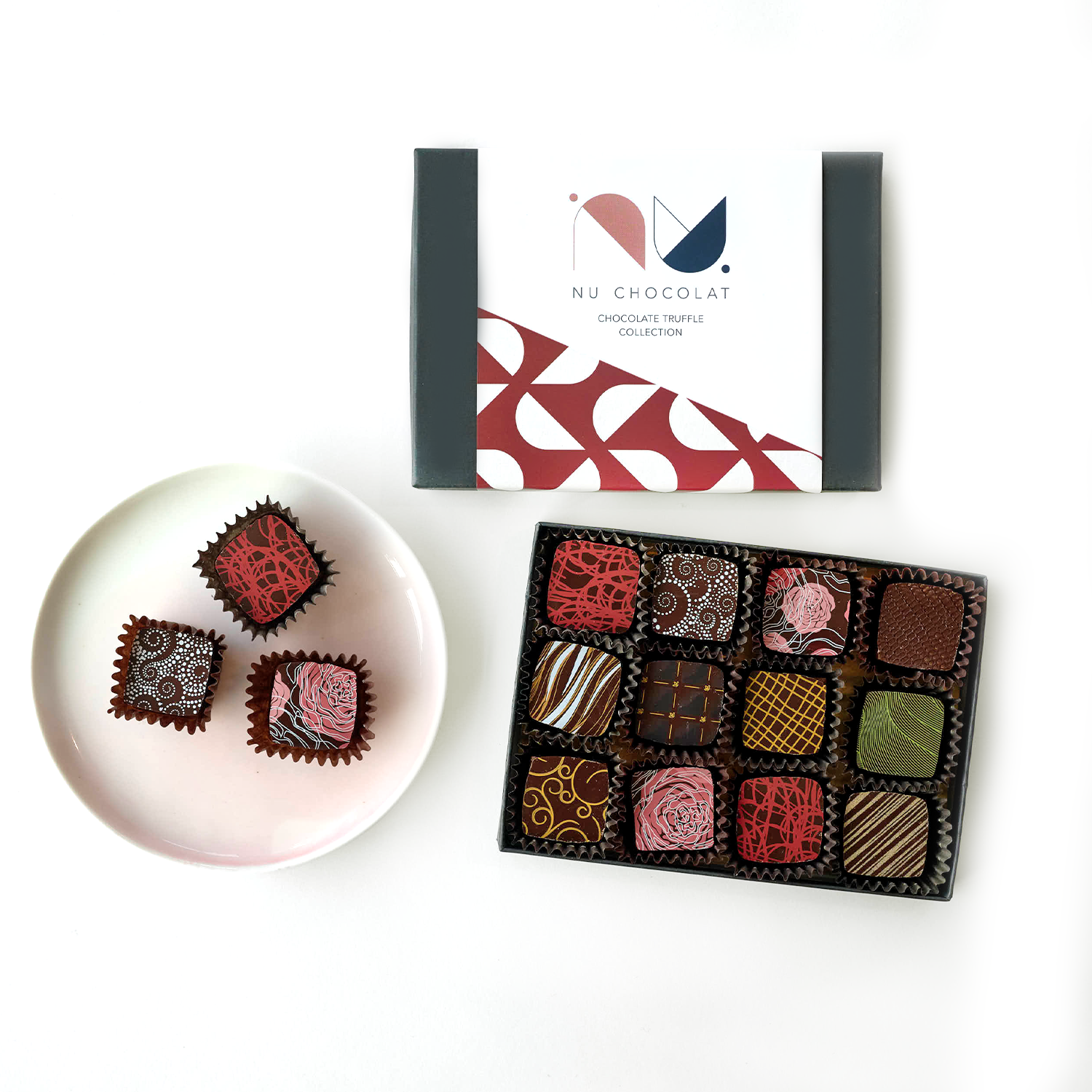 Assorted Chocolate Truffle Ingredients: Dark chocolate (cocoa beans, sugar, cocoa butter, soy lecithin (emulsifier), vanilla), Milk Chocolate (cocoa butter, whole milk powder, sugar, cocoa beans, vanilla, soy lecithin (emulsifier), White Chocolate (cocoa butter, whole milk powder, sugar, sunflower lecithin (emulsifier), vanilla), Vermont cream, kalamansi, raspberry, WhistlePig rye whiskey, butter, honey, lemon, ginger, coffee, fresh mint, fresh rosemary, cranberry juice, orange zest, glucose. dextrose, cardamom, citric acid. Decor (Natural and artificial colored cocoa butter. Made in a facility that processes wheat, nuts, eggs, soy, and dairy.