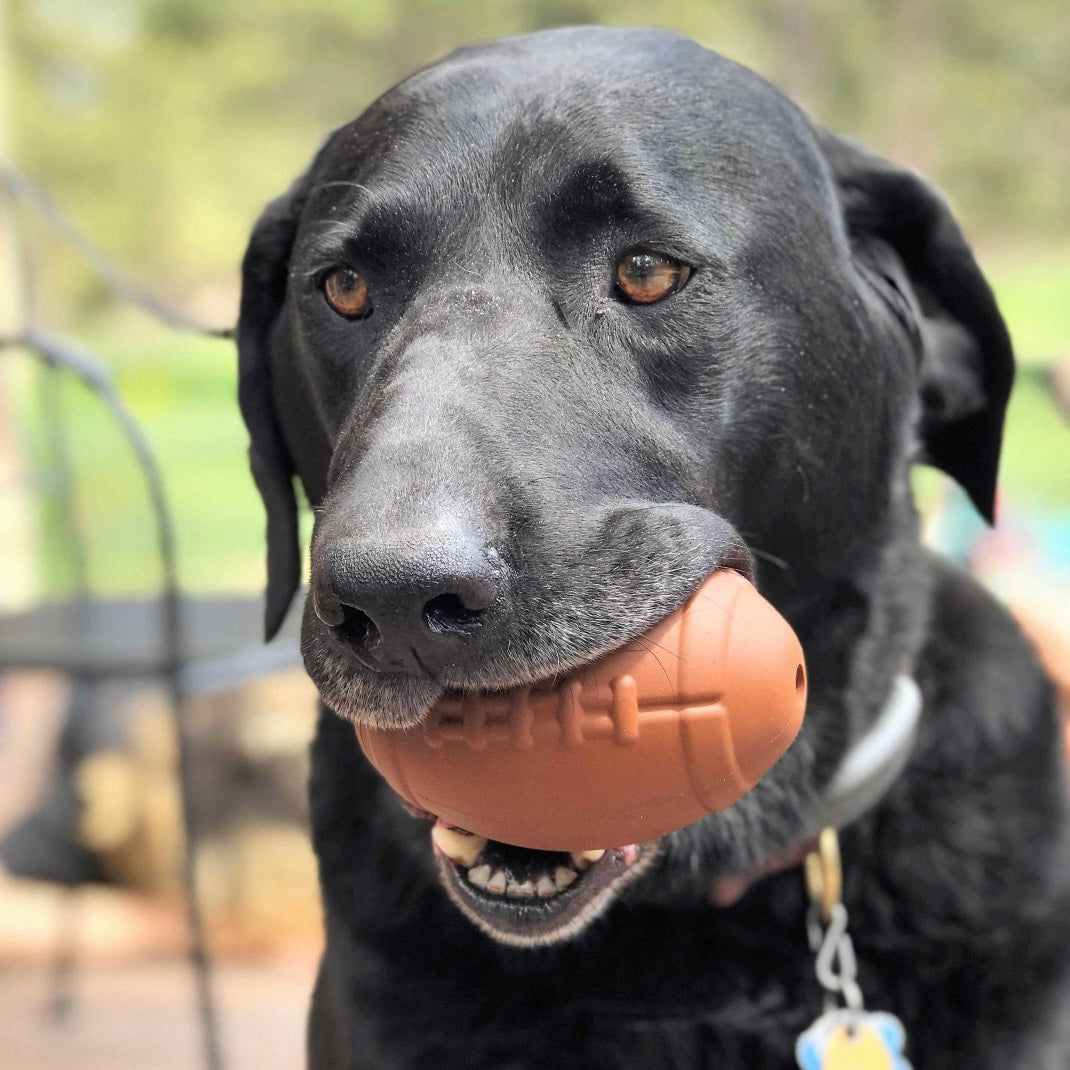Up your dog's game with this treat-dispensing football, designed for power chewers. Fill it with treats, kibble, canned dog food, peanut butter, or your favorite dog treat recipe. For the best results, mix wet and dry foods and freeze.