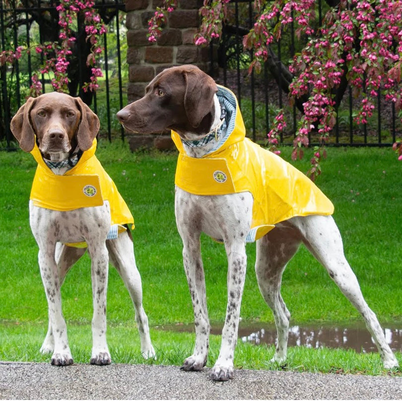 Keep your hound dry in this stylish hooded rain slicker -- and classic ticking stripe lining and decorative embroidery. Hook and loop closures at the neck and chest make dressing a snap. There's also harness notch for convenient leash attachment under the hood.